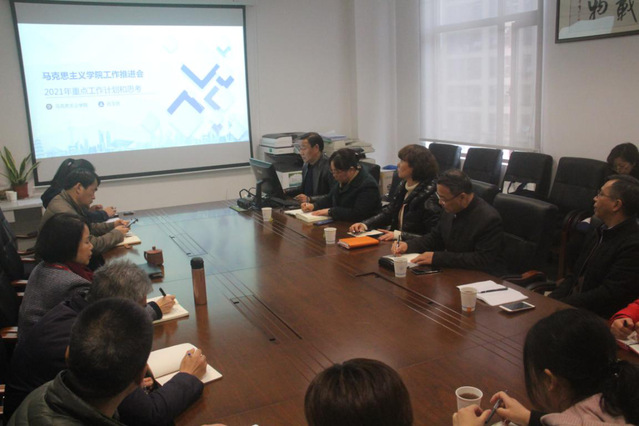 马克思主义学院院长孙玉良代表学院对黄钢校长一行的莅临表示热烈欢迎并做工作汇报。孙院长从学科建设、思政课内涵建设、师资队伍建设、平台建设、人才培养、组织建设等方面介绍了学院2021年重点工作计划,从学科建设、课程建设、教学改革、实践教学、师资队伍、特别是开设《习近平新时代中国特色社会主义思想概论》课程等方面提出了学院“十四五”规划的目标和具体任务,分析了当前学院发展存在的主要问题与思考。随后,学科带头人、教研室主任等踊跃发言,就办公硬件设施、队伍建设、选课制度、教师考核考评机制和人才培养等方面提出了问题与建议。