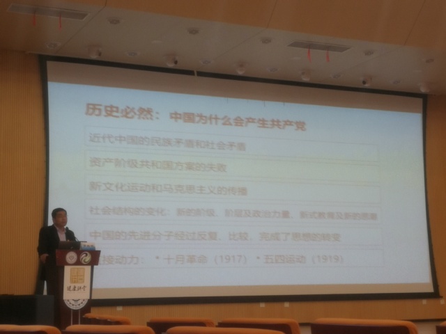 罗博士从3月19日中美阿拉斯加州安克雷奇高层战略对话切入,用生动的党史故事和图片视频资料,从中国共产党成立的历史背景、中国共产党一大召开的过程和成果、中国共产党一大代表的人生谢幕和中国共产党成立精神及其启示等四个方面深入浅出地介绍了中共一大召开的背景、过程和历史意义。“近代中国的民族矛盾和社会矛盾”、“资产阶级共和国方案的失败”、“新文化运动和马克思主义的传播”、“五四运动与南陈北李相约建党”、“中共一大会议的筹备、召开过程、会议通过文件、会议中的争论”,这些历史片段使我们充分认识到中国共产党的成立并不容易,中国共产党从成立始就有深沉的使命责任意识和强烈的历史担当精神。党的第一次全国代表大会正式宣告了中国共产党的诞生,这是中国历史上开天辟地的大事件,从此,中国共产党开始为民族独立、国家富强和人民幸福进行艰苦卓绝的奋斗。最后,罗博士用李大钊先生的话“黄金时代,不在我们背后,乃在我们面前;不在过去,乃在将来”与师生共勉,希望师生不负伟大时代,努力拼搏,书写人生华章。
