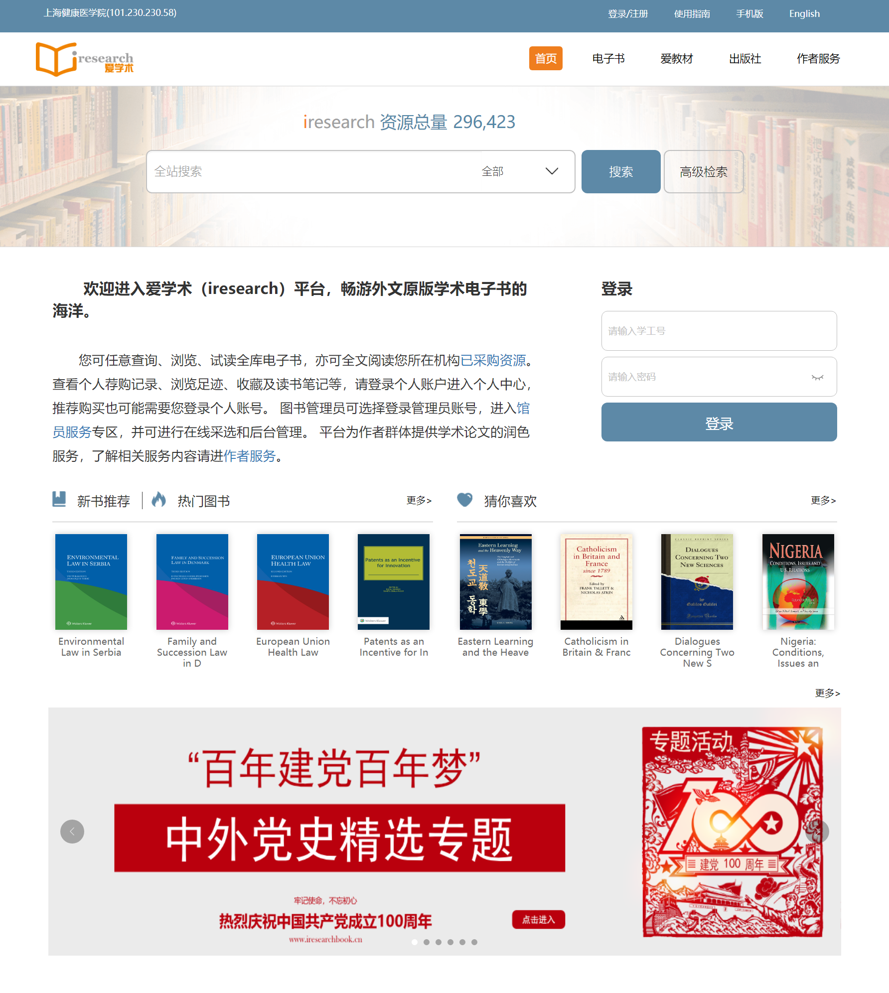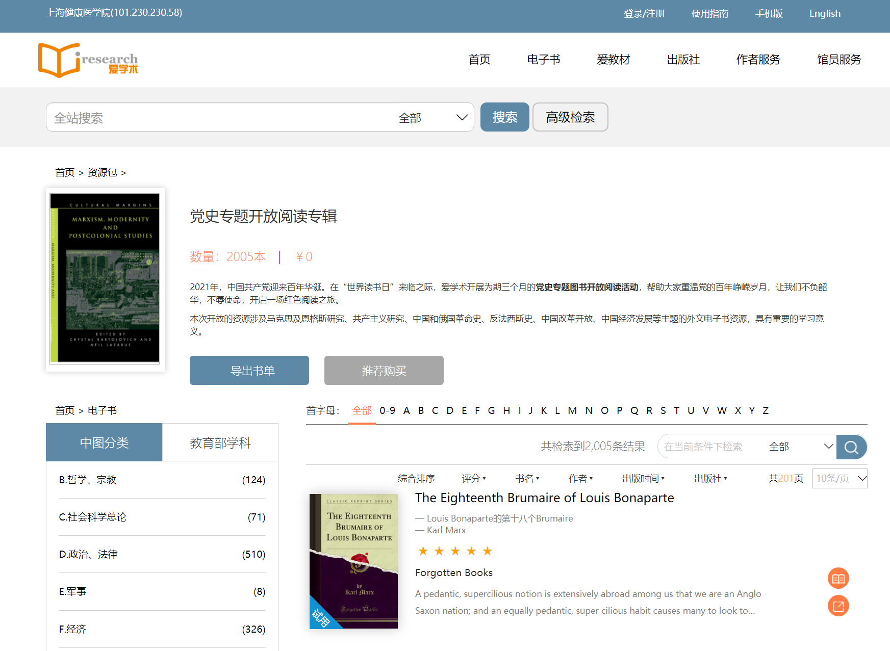 为迎接中国共产党百年华诞,在“世界读书日”来临之际,图书馆联合爱学术(iresearch )推出为期三个月的中外党史精选专题开放阅读活动。本专场资源涉及马恩思想、中国和俄国革命史、反法西斯史、中国改革开放、中国经济发展等,目前可提供463种精选国外电子书资源免费在线阅读,欢迎广大师生试用并多提宝贵意见。