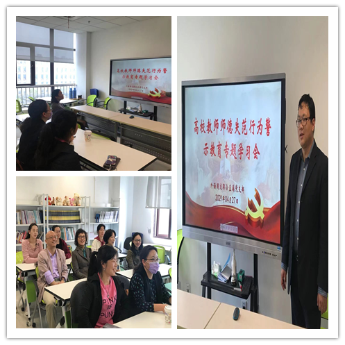 4月27日上午,针对教育部近期公开曝光的8起违反教师职业行为十项准则的典型案例,外语国交联合直属党支部召集全体教职工采用线上线下相结合的方式展开专题学习。老师们将这几起案例特别是涉及到高校部分的内容做了深入剖析,引以为戒,警钟长鸣。