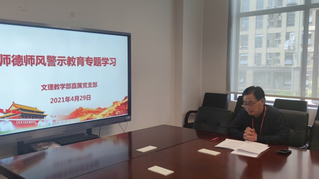 4月29日下午,文理教学部直属党支部在南苑2号楼302召开了“师德师风警示教育专题学习”,党支部书记秦禹权主持了会议,首先通报了教育部公开曝光8起违反教师职业行为十项准则典型案例,特别分析指出了南京邮电大学张某、河南大学文学院侯某、太原师范学院教育学院王某、武某所违纪违法的错误性质,对广大教师的师德师风进行了深刻的警示教育,并组织全体教师认真学习了《新时代高校教师职业行为十项准则》《新时代上海高校教师职业行为十项准则》的相关内容。