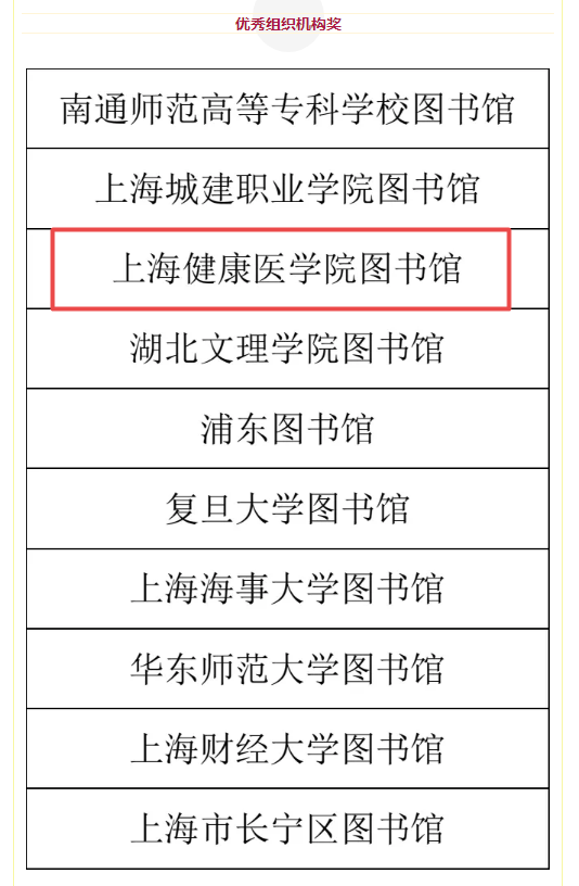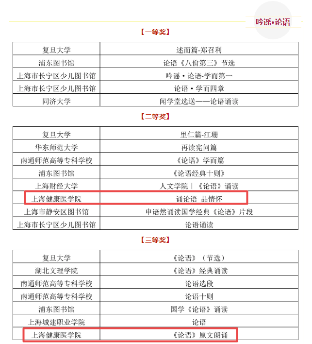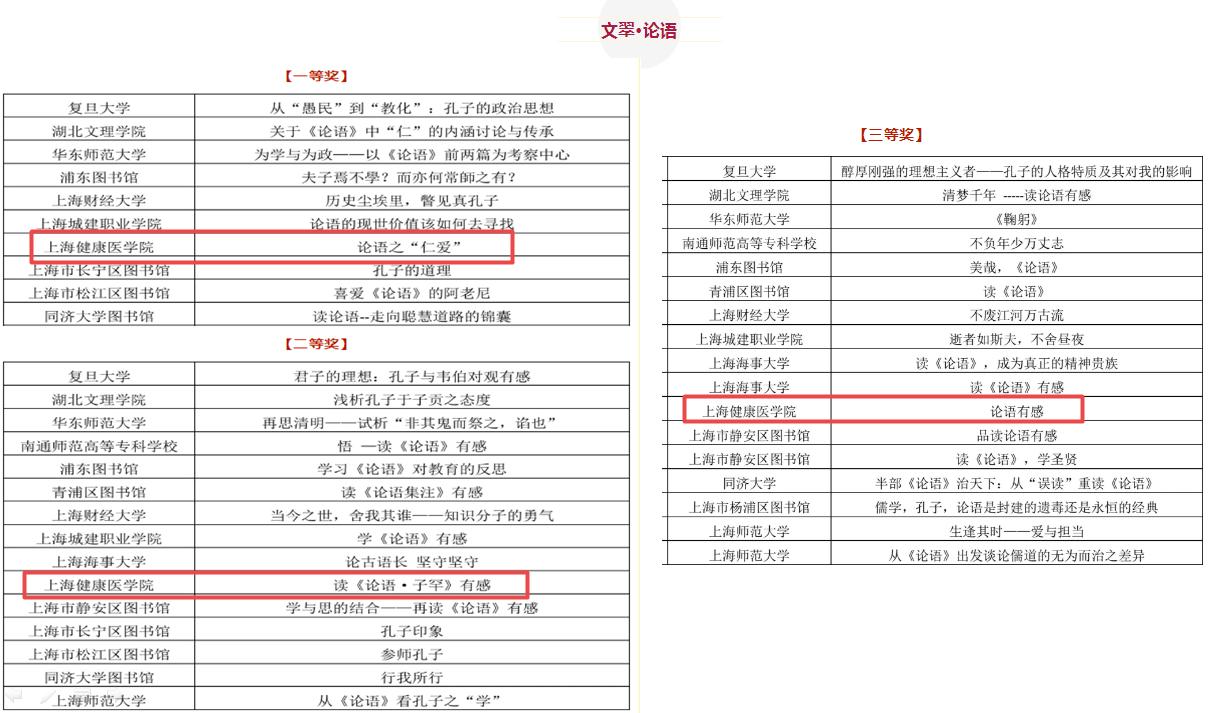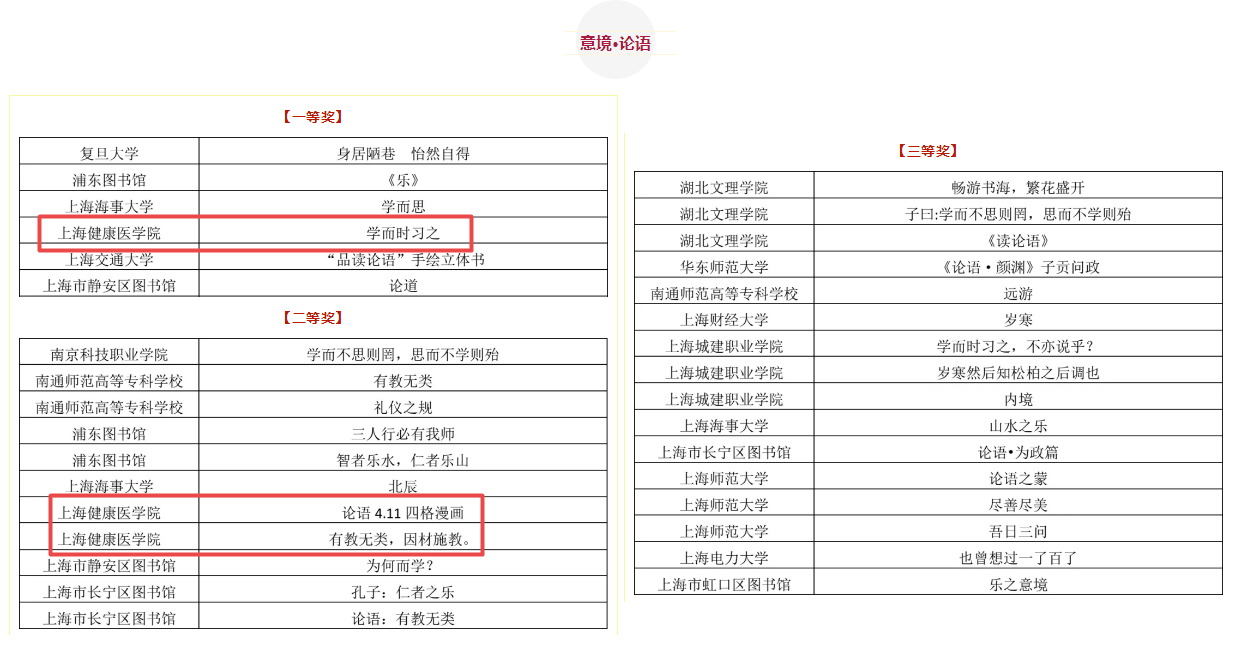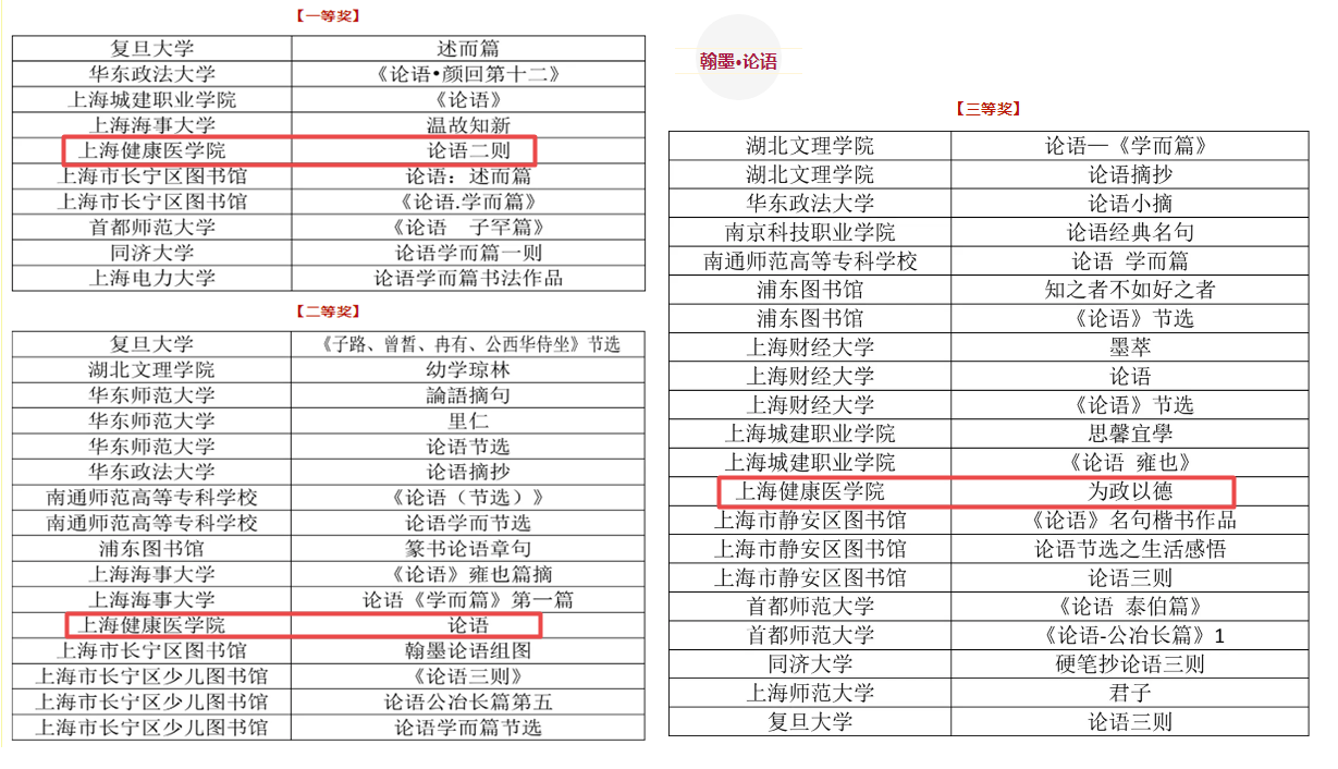 根据赛程安排,推选作品后将开启为期1个月的线上投票,评选网络人气奖。在此期间,图书馆不仅呼吁全校读者为我校作品投票点赞,还组建了参赛小队,不定期提醒参赛选手关注点赞排行榜,为自己的作品打“call”。经过不懈努力,上海健康医学院图书馆不负众望,在比赛中脱颖而出,以104份的作品提交量,在31所报名机构中排名第三,荣获优秀组织奖。在“文萃•论语”板块中,获一等奖、二等奖和三等奖各1名,其中两部作品还获得了网络人气奖的第1名和第9名;在“翰墨•论语”板块板块中,获一等奖、二等奖和三等奖各1名,其中两部作品还获得了网络人气奖的第2名、第10名网络人气奖;在“吟谣•论语”板块推选中,获二等奖、三等奖各1名,其中两部作品还获得了网络人气奖的第1名和第7名;在“意境•论语”中,获一等奖1名、二等奖2名,其中两部作品还获得了网络人气奖的第1名和第8名。