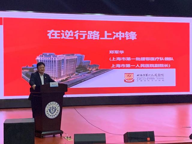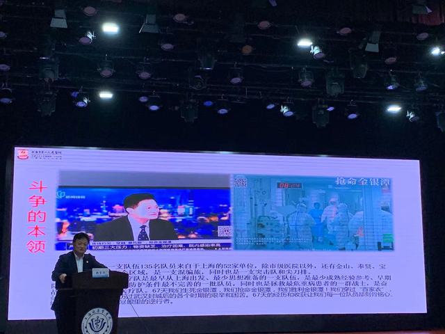 每个时代都有不同的英雄抒写时代的传奇,奋战在“战疫”一线的广大医务工作者一定是这个时代无比伟大的英雄。为进一步加强医学生医学人文教育,提升医学生思想政治素养,培养具有高度社会责任感、高尚医德的医学战线接班人,6月3日下午,在北苑1号楼400人报告厅,上海市第一批援鄂医疗队领队兼党总支书记、上海交通大学医学院附属仁济医院党委书记郑军华莅临我校作“在逆行路上冲锋”主题讲座,为大家介绍上海第一批援鄂医疗队的故事。本次讲座由学工部负责人吕晓丽主持,各学院学生代表共计300人聆听了本次讲座。