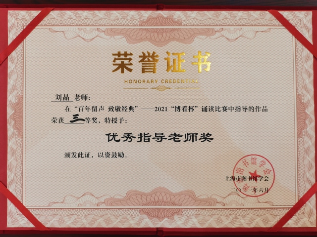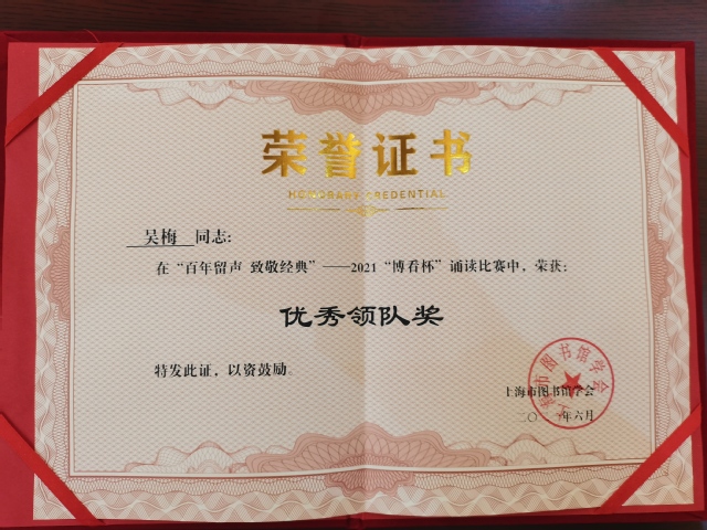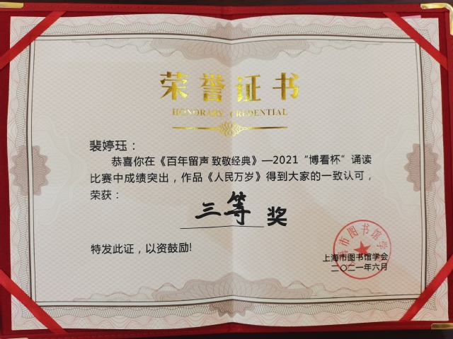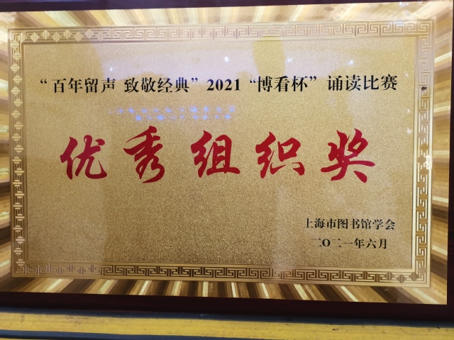 6月18日,由上海市图书馆学会阅读推广委员会主办的“百年留声,致敬经典”——2021“博看杯”经典诵读大赛决赛在上海外国语大学逸夫会堂举办。全市共有23位选手参加决赛,我校选手裴婷珏诵读的《人民万岁》作品斩获三等奖,图书馆荣获优秀组织奖,吴梅老师荣获优秀领队奖,刘晶老师荣获优秀指导老师奖。