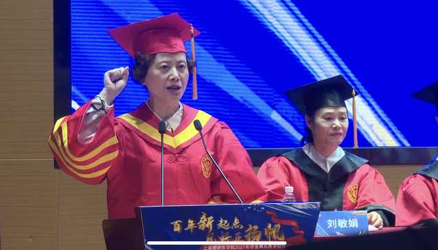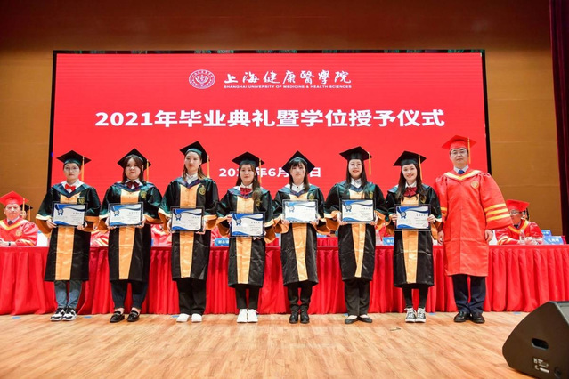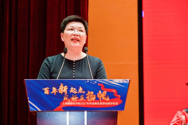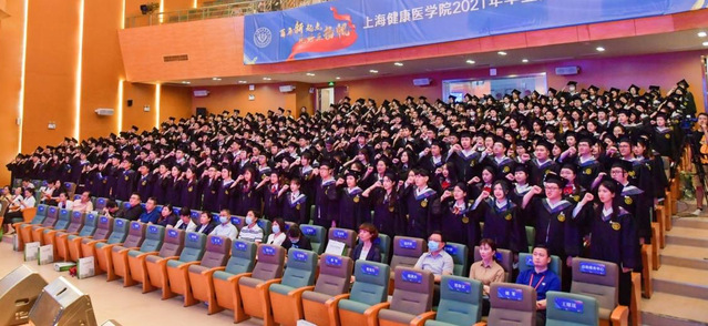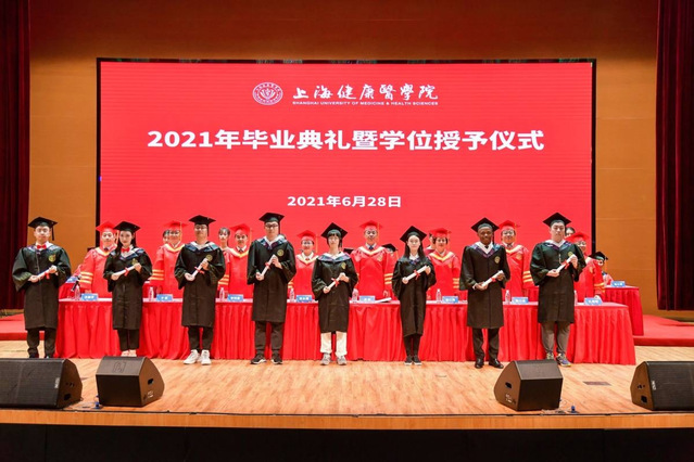百年新起点,风好正扬帆。时值庆祝建党百年之际,上海健康医学院迎来了2021年毕业典礼暨学位授予仪式。6月28日,全体校领导、附属医院领导、社区卫生服务中心健康联盟单位领导、合作企业代表、各学院院长、相关职能部门负责人、毕业生家长代表、2021届本科毕业生代表及2020届毕业生代表齐聚新南苑800人报告厅,共同见证了这一隆重时刻,同时有2万多人次在线观看毕业典礼的直播。典礼由上海健康医学院副校长沈国芳主持。国歌奏响,乐声嘹亮,毕业典礼正式开始。