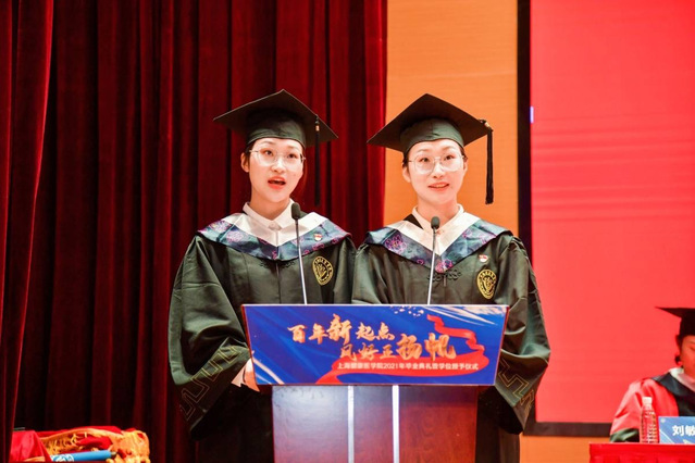 17级药学本科生秦紫瑶、秦紫宸姐妹俩作为毕业生代表发言,她们是一同长大的姐妹,也是一同入校的同学,也将一同成为学校的校友,她们回顾了在上海健康医学院度过的四年充实时光,特别是上健医的国际化办学特色,丰富多彩的学习平台和卓越的设施条件,满足了大家在专业、艺术、体育、科研等全方位的需求,充盈了同学们的精神世界。她们在发言最后表示要时刻秉持“健康精神”,做“厚德至善、健行康民”校训的传承者、践行者和守护者,用心去感受学校的进步和发展,用行动去回报学院和老师的栽培。