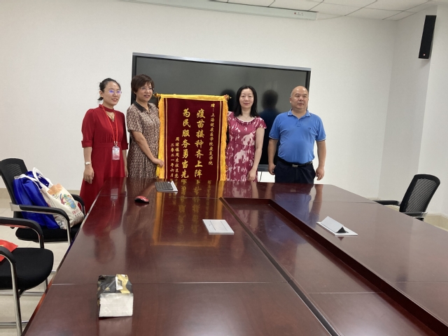 6月29日上午,周东社区党委书记张竹英一行将一面绣着“疫苗接种齐上阵 为民服务勇当先”的锦旗送到康复学院,感谢学院在周东社区的疫苗接种过程中给予的支持和帮助。