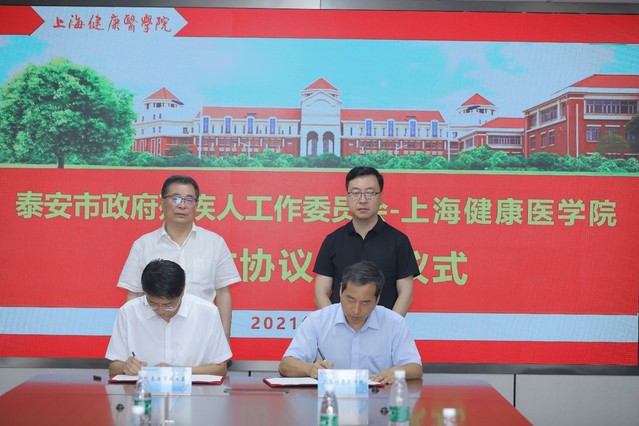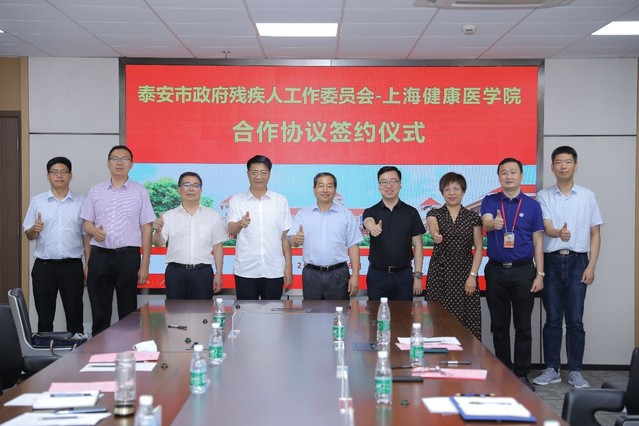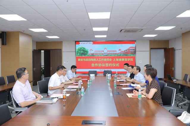 7月8日上午,我校与山东省泰安市人民政府残疾人工作委员会合作签约仪式举行。泰安市人民政府副市长袁久党;泰安市残联党组书记、理事长刘学永;泰安市残联康复部负责人王宁;我校副校长沈国芳;产学合作处副处长(主持工作)金亮;康复学院院长郭琪、党总支书记王红参加签约仪式。仪式由金亮主持。