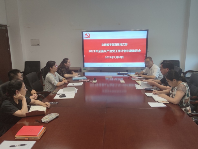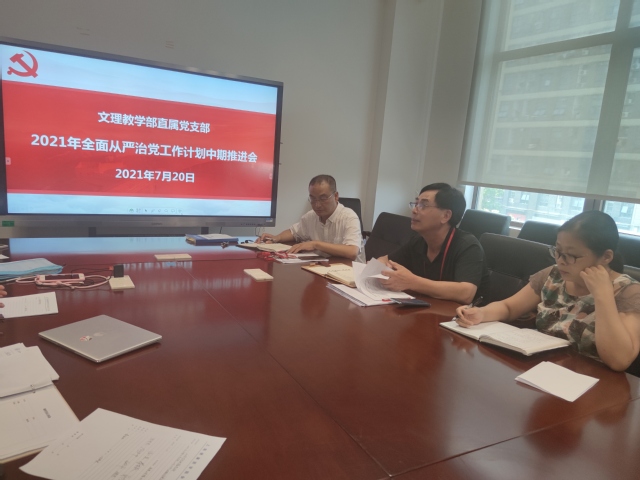 7月20日下午,文理教学部直属党支部在南苑2号楼302会议室召开2021年全面从严治党工作推进会,教学部领导班子成员、支委委员、组织员、教研室主任、特约监察员参加本次会议,会议由直属党支部书记秦禹权主持。