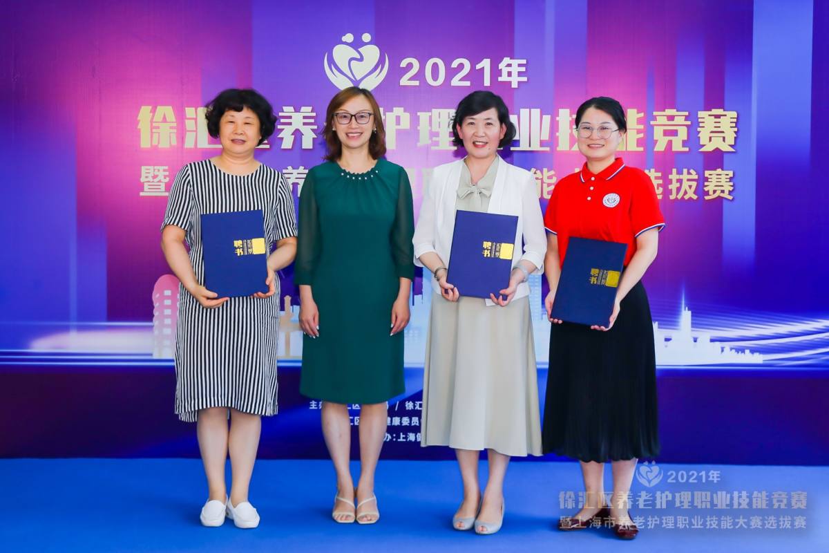 最后徐汇区民政局党组书记、局长郭艳楣上台为朱小凤女士(上海市第一社会福利院党支部书记、副院长)、杨爱萍女士(上海健康医学院专任教师)、曹文婷女士(上海健康医学院专任教师)颁发了徐汇区养老服务机构护理职业技能专家聘书。
