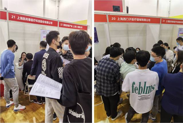 11月4日下午,医疗器械学院2022届毕业生专场招聘会在我校南苑体育馆二楼举行。本次招聘会吸引了强生医疗、西门子医疗、雅培诊断、微创医疗、上海电气、上药器械、之江生物、昊海生物、透景生物、凯利泰、康德莱等国内外医疗器械领域上市公司和知名企业22家(20家上市公司)参加。医疗器械学院2022届医疗产品管理专业学生以及其他相关专业约300名毕业生进场招聘。