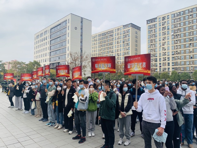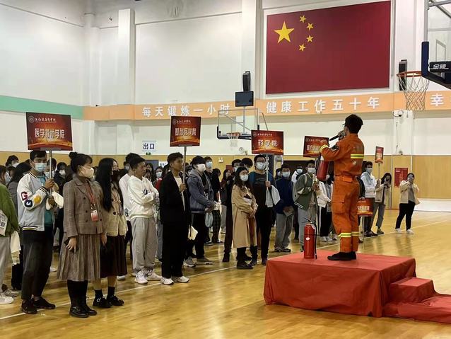 中午12时,随着总指挥“2021年上海健康医学院消防逃生灭火救援综合演练”口令响起,体育馆内顿时烟雾四起,霎时滚滚浓烟从窗口、楼道口冒出。学校迅速启动应急救援疏散预案,在学校义务消防员及学生平安志愿者们的引导下,同学们用毛巾捂住口鼻,压低身姿,分别从体育馆楼梯进行疏散,迅速有序地往安全地点撤离。待全体师生紧急疏散到指定疏散地点(教学楼广场),工作人员迅速检查楼中各区域确认是否有人滞留或其他意外情况,然后迅速返回集合地点、清点人数,并向总指挥上报疏散情况。整个过程中,同学们动作迅速、紧张有序,总共耗时3分钟左右。