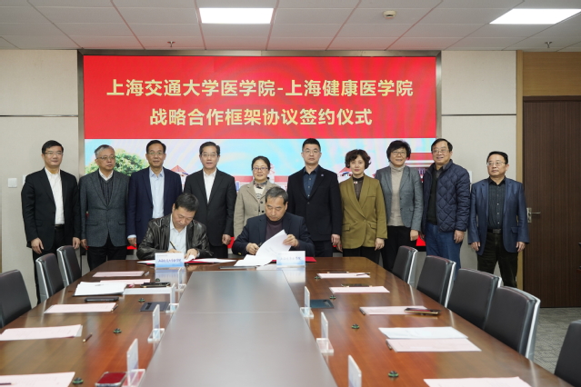 上海交通大学医学院副院长方勇与上海健康医学院副校长沈国芳签署《上海交通大学医学院-上海健康医学院战略合作框架协议》。两校将对接国家和地方战略,创新高校间协同发展新模式,资源互补、错位发展、积极探索建立以党建联建、干部交流、师资培养、人才培养、科学研究、见实习基地建设等为做重点的紧密型战略合作伙伴关系。