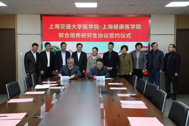 上海交通大学医学院副院长胡翊群与上海健康医学院副校长孔宪明签署《上海交通大学医学院-上海健康医学院联合培养研究生协议》。两校将构建研究生联合培养机制与模式,在“基础医学”“临床医学”、“口腔医学”、“公共卫生与预防医学”、“药学”、“医学技术”、“护理学”等学科博士、硕士点招收博士研究生、硕士研究生,为加快发展同具有世界影响力的社会主义现代化国际大都市相匹配的一流教育,把上海建设成为全球公共卫生体系最健全的城市之一作出更大贡献。