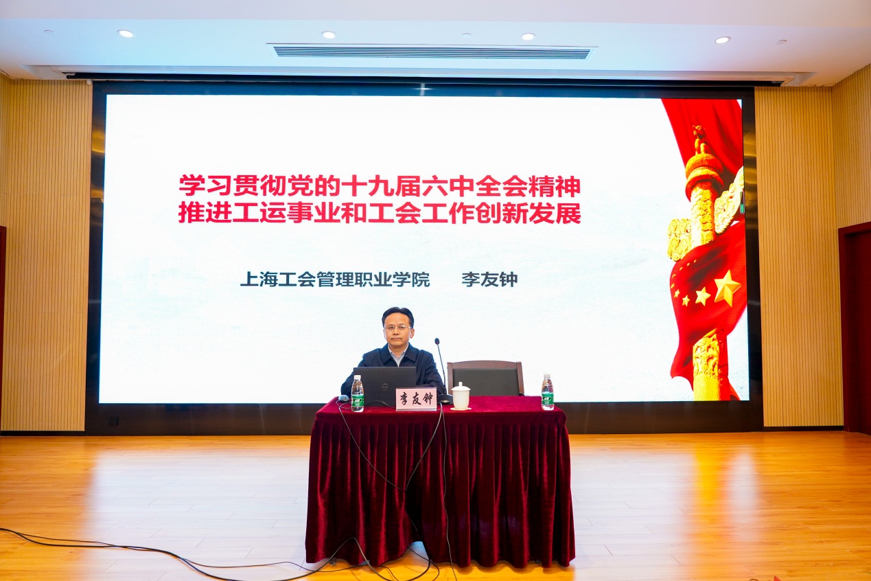 培训第一部分,特邀上海工会管理职业学院李友钟院长做了题为“学习贯彻党的十九届六中全会精神推进工运事业和工会工作创新发展”的专题讲座。他从深刻领会十九届六中全会的精神内涵及贯彻落实十九届六中全会精神思考二大方面进行了全面阐述。对照十九届六中全会精神工会在坚持党的领导、角色定位、主力军作用、职工为本、交流合作及改革创新上积极思考,推动新时代工会工作高质量发展等方面进行讲解,与会学员收获颇丰。