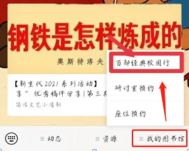 1. 关注“上海健康医学院图书馆微信公众号”,点击“我的图书馆-百部经典校园行”;