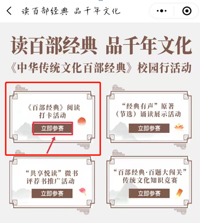 《中华传统文化百部经典》阅读打卡活动是“读百部经典,品千年文化”系列活动之一,旨在通过阅读打卡竞赛的形式,培养大学生阅读经典的习惯,传播中华优秀传统文化,引导读者从中华优秀经典中汲取养分和力量,认真思索生命的价值与意义,共筑中华民族家国情怀,增强文化自信。