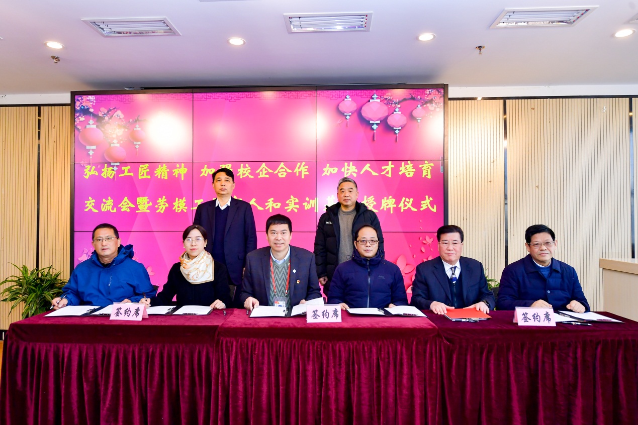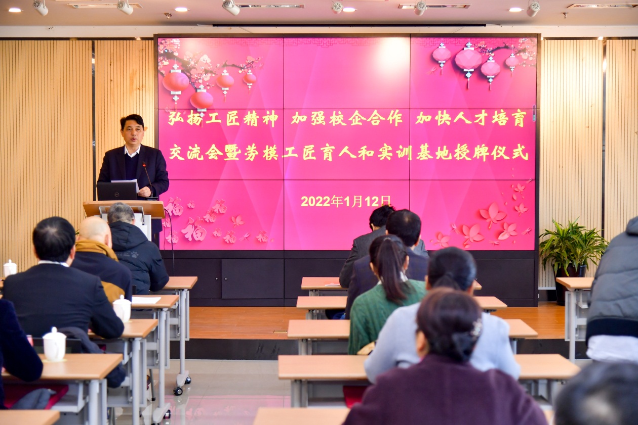 钱传东通报劳模工匠育人和实训基地创建情况。随后由钱传东和陶文捷见证了12所学校代表和工匠代表的签约仪式。