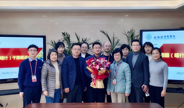 张鹏同志于2021年9月赴新疆喀什职业技术学院,任职医学系副主任,为期一年半。会上,他首先汇报了自己援疆半年主要工作开展情况,介绍了自己在喀什的所见、所感、所悟。用他自己的话说,援疆是他心中始终长存的情怀,也是人生中非常有意义的重要经历。工作之余,他经常深入思考援疆三问:“援疆为什么?在疆干什么?离疆留什么?”通过不断提高政治站位,“讲纪律、讲奉献、讲学习”,做到思想上入疆、感情上融疆、生活上适疆,为沪喀交流搭建良好桥梁纽带,讲好健康故事,努力树立上海援疆干部良好形象。