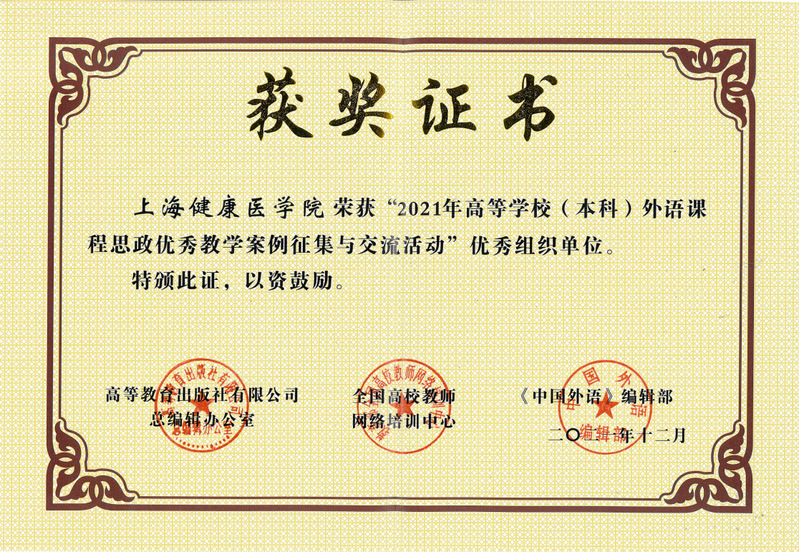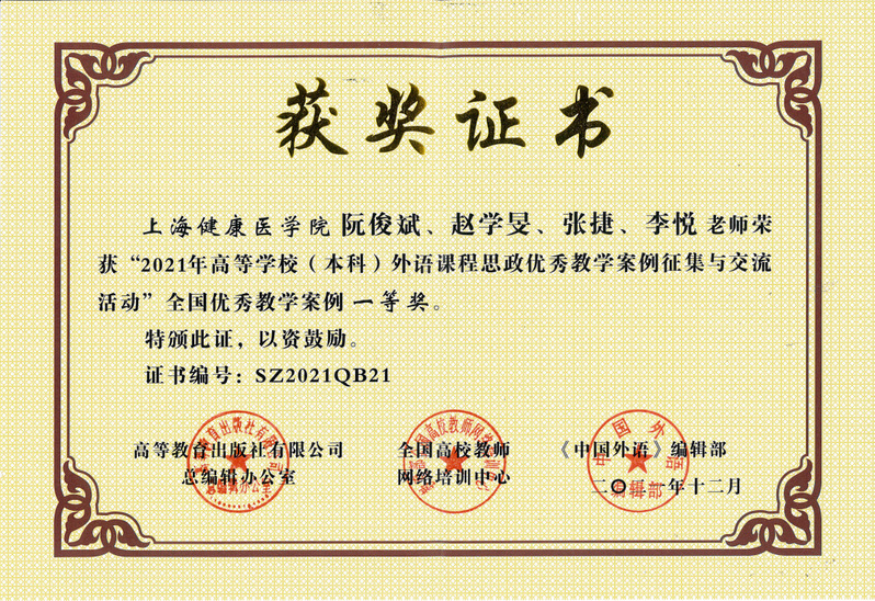 本次成功参赛并获得全国外语类课程思政类重要奖项是外语教学部在教务处指导下,以教育部《高等学校课程思政建设指导纲要》为基础,创造性地结合对医学生的明其德教学思路,通过理论教学和实践教学,帮助他们用历史眼光、世界眼光、辩证眼光、发展眼光看世界、看中国、看社会,增强文化自信。同时,这也体现了外语教学部将培养学生多样化、个性化、地域性和针对性等元素融合于在外语课程思政实践教学改革中,主动与新文科人才培养模式相契合,充分调动教师的主导性和学生的主体性,有效地将师生的价值获得感转化为良好的育人效果。(外语教学部)