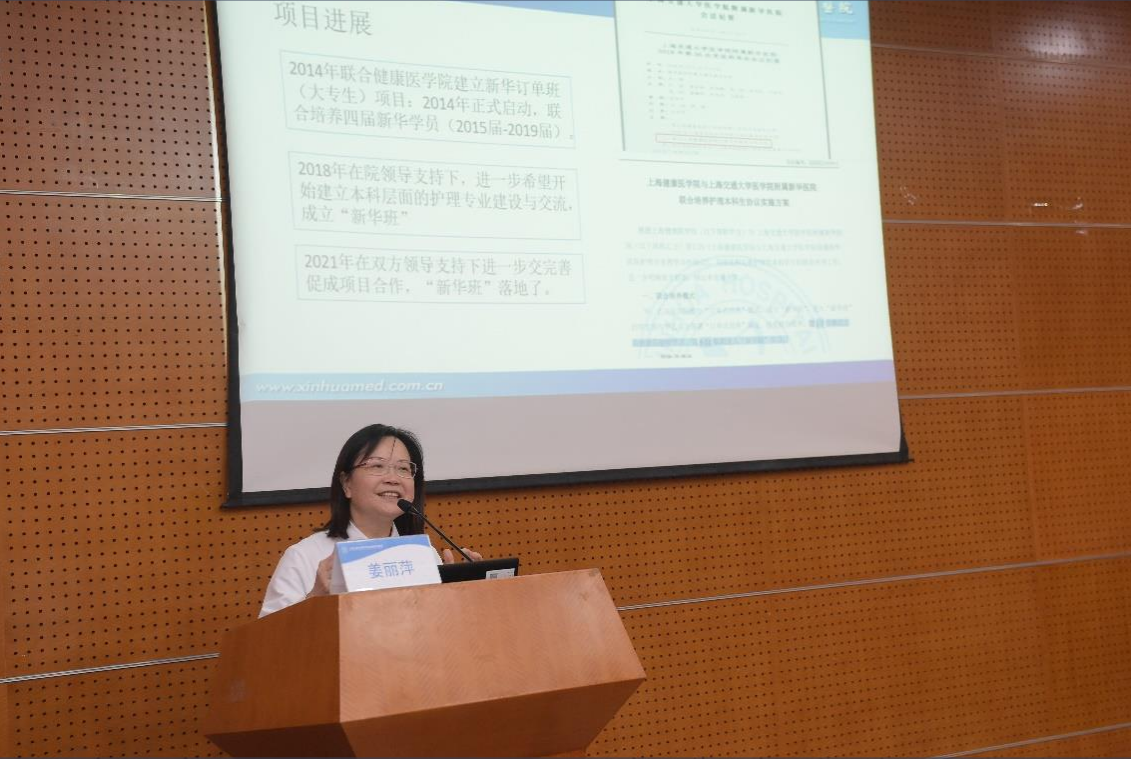 姜丽萍首先回顾了自2018年以来本项目的推进过程,并分别从合作理念、合作模式、教育模式、教学模式、管理模式五个方面介绍了联合培养模式和合作方式,旨在通过创新的教学与管理,进一步激发学生的专业兴趣、增强专业感知、夯实专业知识、促进实践技能、提升沟通能力,让进入“新华班”联合培养的每一位学生在亦师亦友的大家庭中,尽早更好地实现角色认同、职业认同和专业认同,最终为护理学科发展做出贡献。