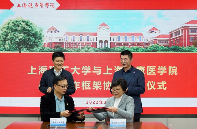 在吴韬和丁晓东的共同见证下,于莹、刘平签署了《上海健康医学院—上海理工大学战略合作框架协议》。