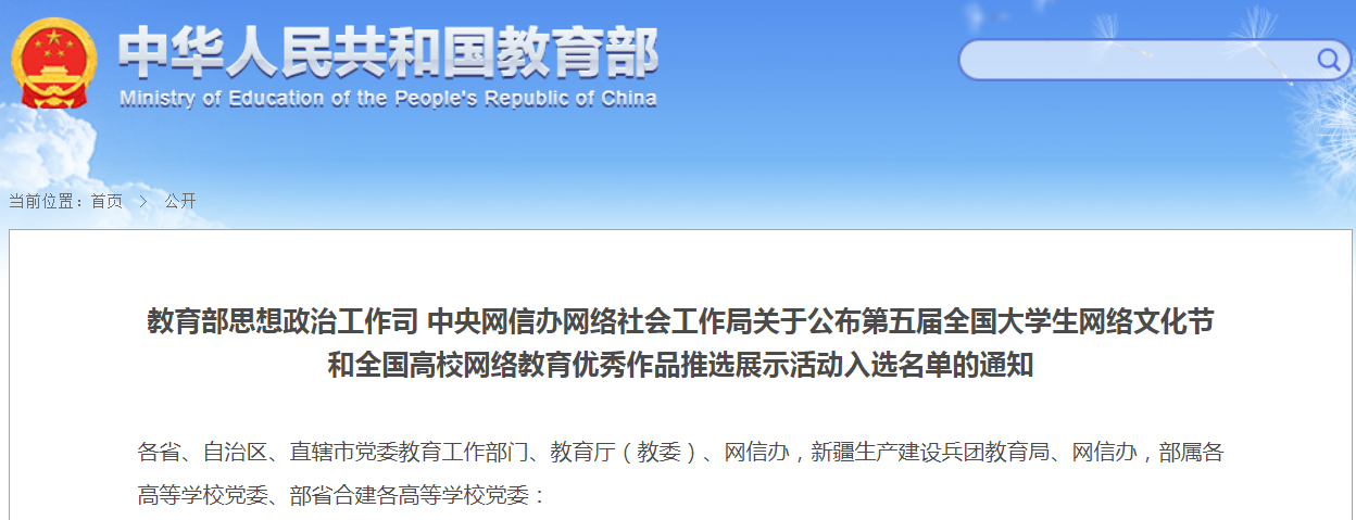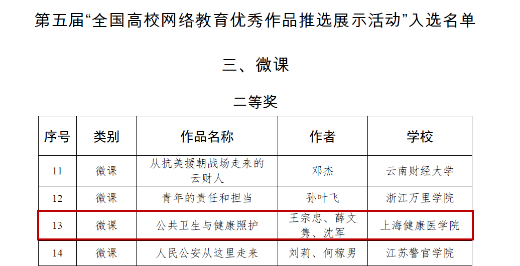 近日,教育部思想政治工作司、中央网信办网络社会工作局公布了“第五届全国大学生网络文化节”和“全国高校网络教育优秀作品推选展示活动”评选结果。我校教师作品《公共卫生与健康照护》荣获全国高校网络教育优秀作品推选展示活动微课类二等奖。