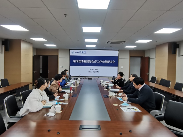 3月4日上午,临床医学院国际交流与合作工作专题研讨会在北苑1号楼902会议室召开。副校长沈国芳、国际交流处处长薛文隽、外语教学部副主任沈军、临床医学院院长蔡巧玲及专家团队张勇教授等参加会议。
