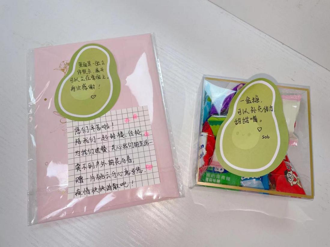 “孩子们也很体谅我和楼管阿姨的工作,无论是早上6:00分发早饭,还是晚上10:00清点人数,都会关心我们的安全和健康,还有几位小可爱们把自己之前囤的美食分享给我们。楼里的几位学生党员和预备党员也起到模范带头作用,在没有过多的防护服下,依然能挺身而出帮助老师们完成楼里的日常工作,真的特别感谢这些志愿者们。”