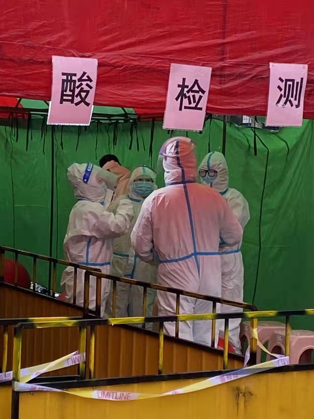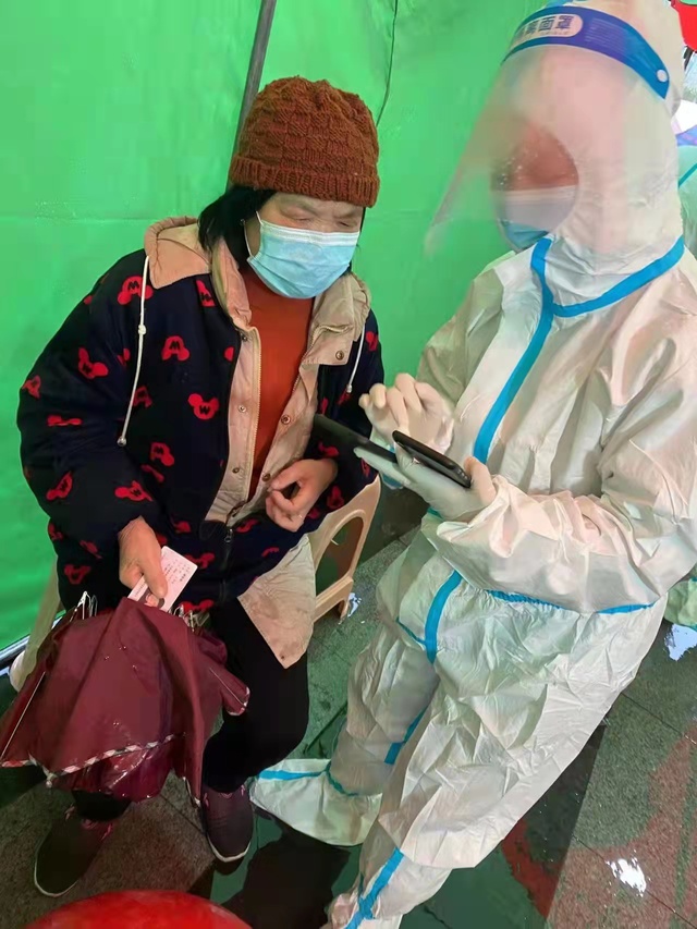 3月20日,在浦东新区新场镇新环广场核酸检测点,身穿大白的曾冬冬老师站在入口处,招呼居民有序检测核酸。她的工作任务是与其他志愿者们一起,维持核酸检测大棚入口秩序,提示居民准备好核酸检测预约码,同时用自己的手机帮助没有预约码的老人预约核酸检测,再请排在队伍里的愿意帮忙的年轻人帮忙拍预约码的照片顺便带老人过去检测核酸。从早上6:50开始一直到晚上最后一个居民结束核酸检测,除了吃午饭和上厕所,她一直坚守在岗位上。“非常累,非常冷,袜子又全湿了,腰酸死了,嗓子有点疼”,这是她最真实的感受;“大家不要着急,核酸检测很快的,预约码准备好,下雨天有点滑,注意安全”,这是她重复最多的一句话;“这是我声音最温柔的一天,我服务了很多熟悉的邻居”,她自豪地跟人讲:“一天,粗算下来近万人走进了这个核酸检测大棚,没有发生混乱,不容易的!”