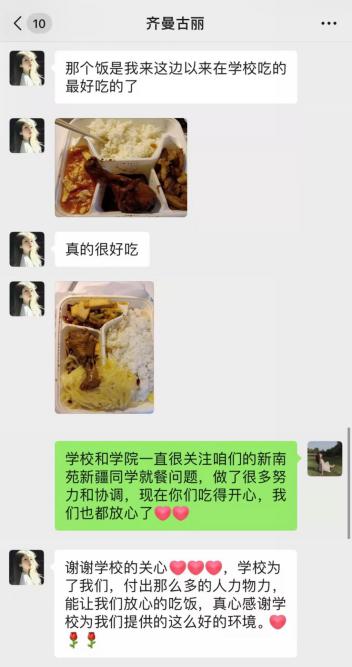 为了保证同学们的及时用餐和供应平衡,同时减少人员接触,药学院组建了新疆少数民族学生互助团队。20级的娜迪热和21级的萨吾烈同学每天统计所有新疆同学第二天的三餐用餐需求,每个中午和晚上在新南苑每栋宿舍楼下都能看到他们和辅导员一起按名单分发盒饭的身影,保证可口卫生的清真饭菜能送到每个订餐同学的手上。学生的一句“这是我吃过最好吃的饭菜了”就是对药学院辅导员、领导,对各职能部门老师和学校领导最好的褒奖。