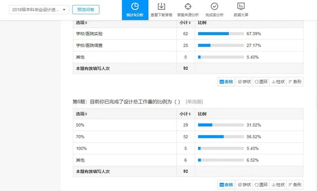 开展线上摸底调查。做到了解细节关注到每一位同学为了掌握每位同学的毕业设计进展情况,通过线上的调查问卷对本学年的119名同学的毕业设计情况进行摸底排查,来了解他们各自的进展情况,遇到的问题以及预期情况,以及时作出针对性的帮助。