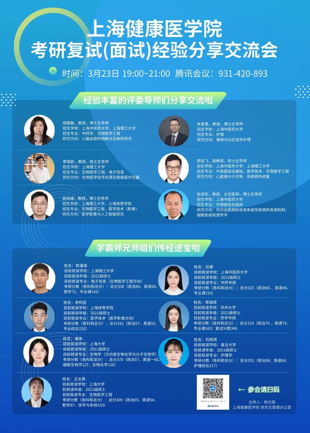 疫情挡不住春天的脚步,疫情更激发了每一位敬畏生命,心怀理想的医学生投身医学科研,追求精湛技艺,愿促吾之学、尽吾所能完成健康所系、性命相托的医学誓言。随着硕士研究生复试国家线以及各个高校的复试线相继出炉,为更好地帮助2022届考研学生积极应对复试,在我校党委的大力支持和指导下,3月23日晚,我校研究生管理办公室通过线上交流分享的方式召开上海健康医学院考研复试(面试)经验分享交流会。邀请经验丰富的评委导师和2021届考研成功上岸的学长学姐们分享复试经验和面试技巧,我校2022届备考复试考生以及大三、大二有意愿考研学生200余人线上参加此次分享交流会,会议由研究生管理办公室杨文晓老师主持。
