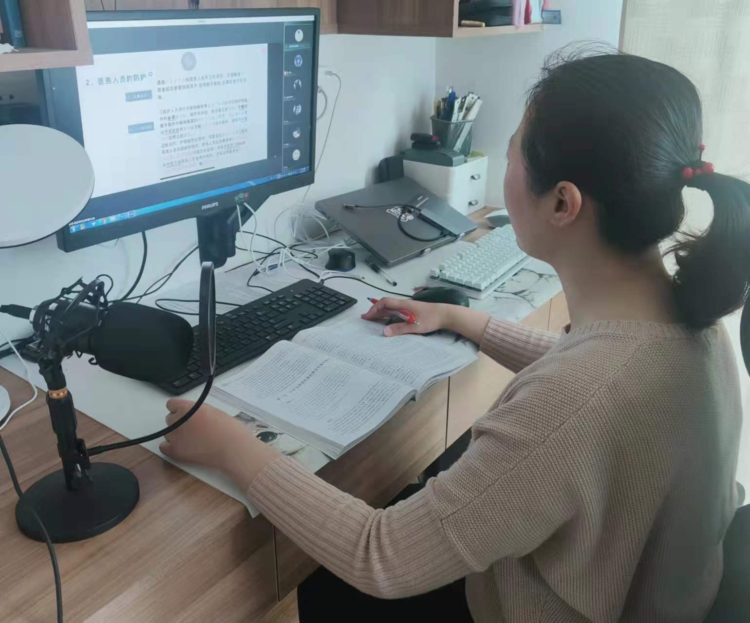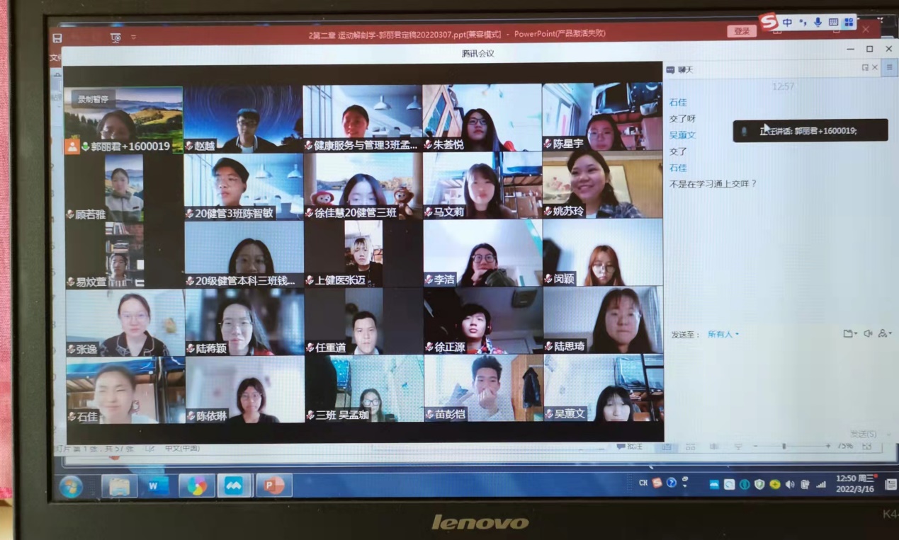 郭丽君教授是学校九三学社的支委委员,也是护理与健康管理学院的老师,她在给健康服务与管理专业的学生上运动健康学课程。为实时了解学生的学习状态,她要求学生打开视频。在郭教授的努力下,班中同学的学习效率大大提高。