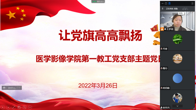 面对当前严峻疫情形势,为鼓励党员积极发挥战斗堡垒作用和先锋模范作用,3月26日晚,医学影像学院教工第一党支部在线上举行“让党旗高高飘扬”主题党日。