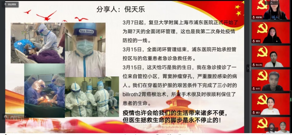 倪天乐同志分享了自己在实习医院的经历,与带教老师一起穿着防护服进行抢救手术,表达了对一线抗疫工作者的敬意。