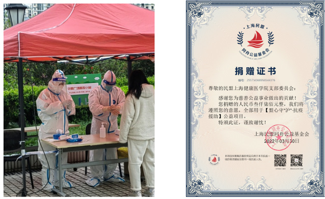 封校期间,学生快递滞留在绿地菜鸟驿站无法取出。为此,学校招募志愿者老师,帮助学生解决取件难的问题。正在家中备课的方文娟老师看到招募令后积极报名参加,她说“只想用自己的一点绵薄之力为大家做一些微不足道的事情。”小区封控期间,各位老师积极报名社区志愿者,用自己的专业知识发光发热。杨丽君老师连续多日服务,协助核酸检测、发放抗原自测试剂盒、指导操作、查看结果等;聂志妍老师辅助来自南京的支援队伍核酸检测采样,现场组织安排等;莫非老师、王翠平老师家中两个孩子,却也活跃在社区志愿的岗位上。作为民盟成员的教研室两位老师积极参与捐款活动,为一线抗疫工作者献出自己的一片心意(图4)。