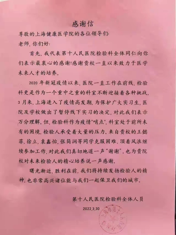 疫情就是命令,防控就是责任。一份核酸检测结果,是疫情研判的重要依据,也是许多人出行的“通行证”、回家的“定心丸”。而每一份看似简单的核酸检测结果背后,是一群检验人分秒必争、日夜坚守的结果。他们是面对病毒最近的“战士”,是新冠疫情歼灭战中的“排雷兵”,在医学技术学院就有这样几位新“检验人”。疫情当下,奋勇前行,医学技术学院王懿菲、徐立、袁鑫怡、张简润等四位学子的积极行动得到了上海市第十人民医院检验科全体人员的高度赞扬,特此发来了感谢信(图1)。