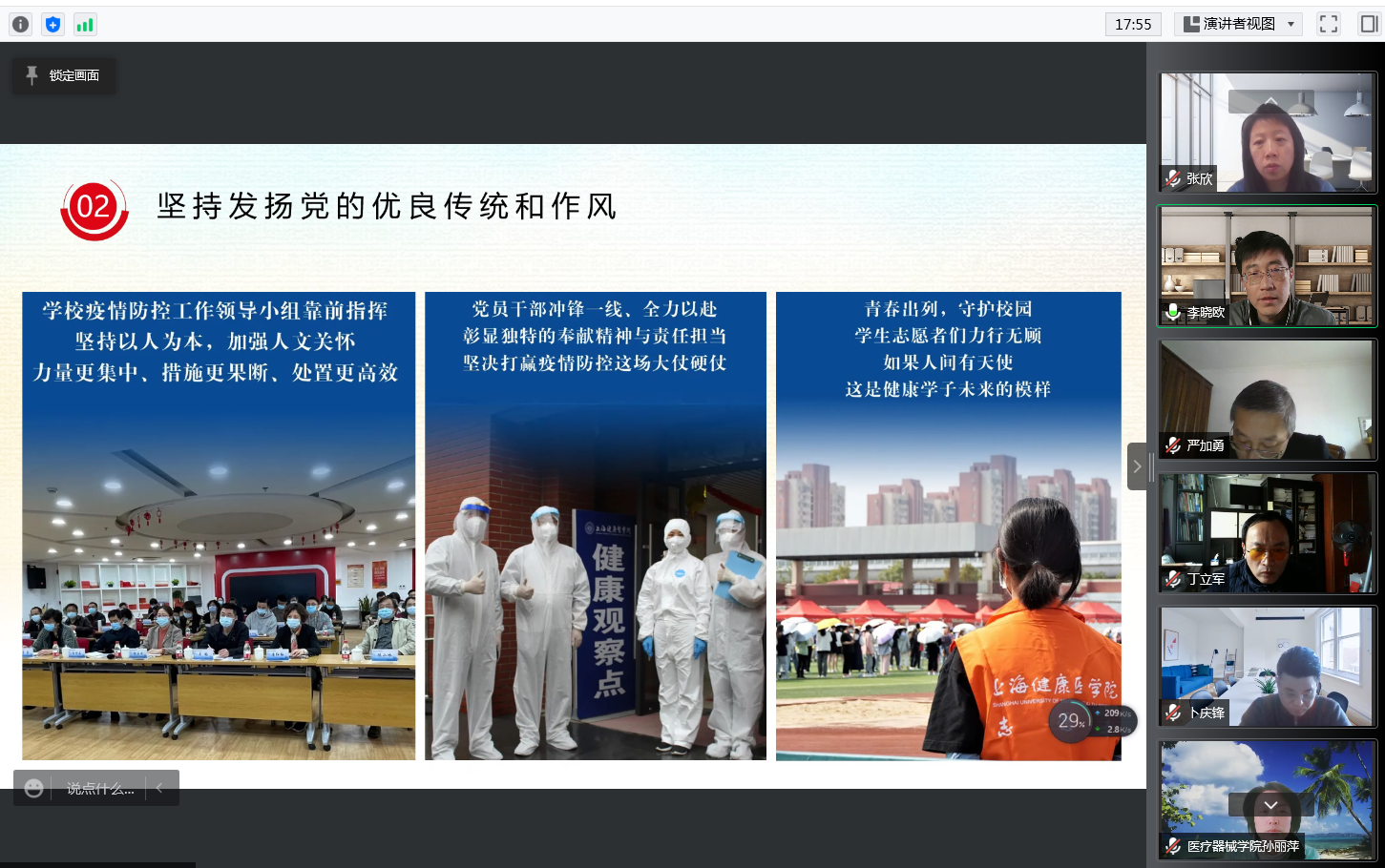 在“不断提升特殊时期的工作本领和能力”部分,李晓欧强调,突如其来的疫情,考验的不仅是党员干部的初心和使命、作风和意志,更是本领和能力,要求全体党员“要强化责任担当,清醒认识当前校园疫情防控的复杂性、严峻性,坚决杜绝麻痹思想、侥幸心理、松劲心态,从严从紧、抓实抓细各项防控工作”、“要严格防控措施,准确理解有关防疫政策,严格执行学校疫情防控相关工作要求,同时要坚决服从社区管理,严格遵守学校相关疫情防控规定和社区疫情防控要求”、“要宣传教育到位,提高师生自我防护意识,加强正面教育,做好心理帮扶疏导工作”、“要做好日常工作,稳步推进线上教学、学生毕业设计、本科学士学位授权审核、本科教学合格评估等工作”、“要发挥党员作用,党员同志要在疫情防控工作中践行初心使命,积极参加各类志愿服务活动,要让‘党旗飘在一线,堡垒筑在一线,党员冲在一线’,充分发挥基层党组织战斗堡垒作用和党员先锋模范作用”,树牢“我就是医械人”的主人翁意识,齐心协力保证学院各项工作有序进行,思想不乱、队伍不散、工作不断。
