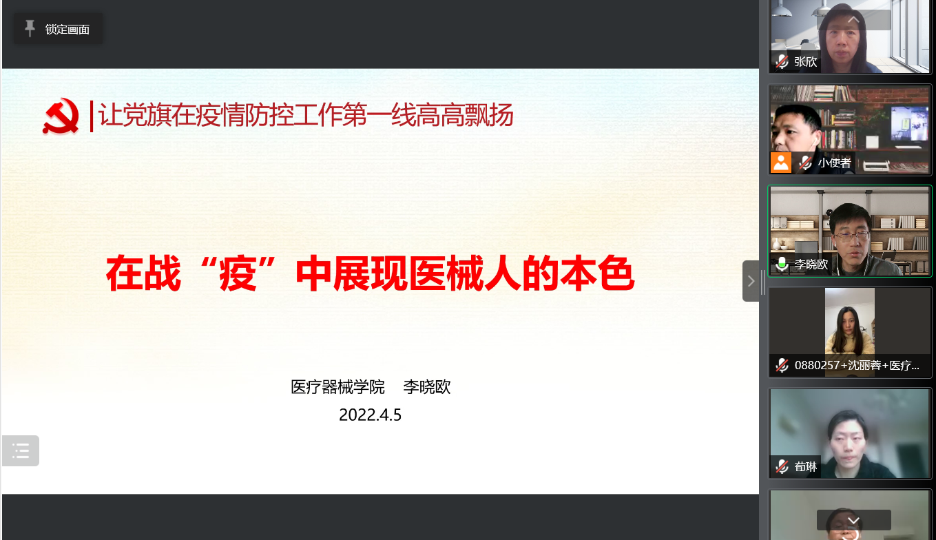 4月5日上午,医疗器械学院党总支通过腾讯会议平台召开中心组(扩大)学习会议,学院党总支委员、各党支部书记及委员、团总支书记、教研室主任、科级干部、工会主席等参加了会议,学院党总支书记李晓欧从“始终牢记初心使命”、“坚持发扬党的优良传统和作风”、“不断提升特殊时期的工作本领和能力”三个方面讲专题党课《在战“疫”中展现医械人的本色》。