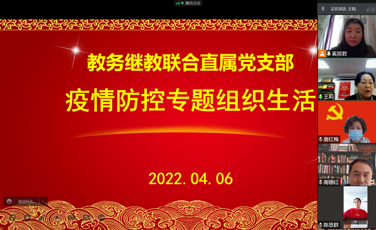 4月6日,教务继教联合直属党支部根据学校《上海健康医学院关于召开疫情防控专题组织生活的通知》要求,召开了线上线下相结合疫情防控专题组织生活会。支部全体党员参加了组织生活会,会议由王莉书记主持。