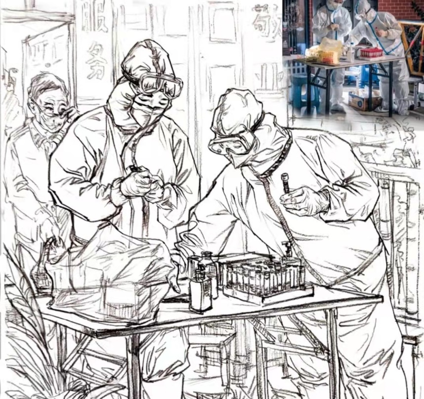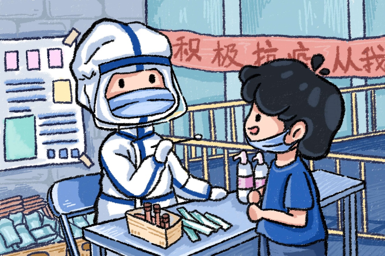 说明:新冠疫情期间,核酸检测几乎成了居民们每周的必做项目,成为了“抗疫日常”;医护人员们为居民们做咽拭子、鼻拭子的模样已然深深地留在了人们的脑海中,就如画中的“积极抗疫,从我做起”,我们要在感激医务人员辛勤工作的同时,保护好自己,渡过难关。