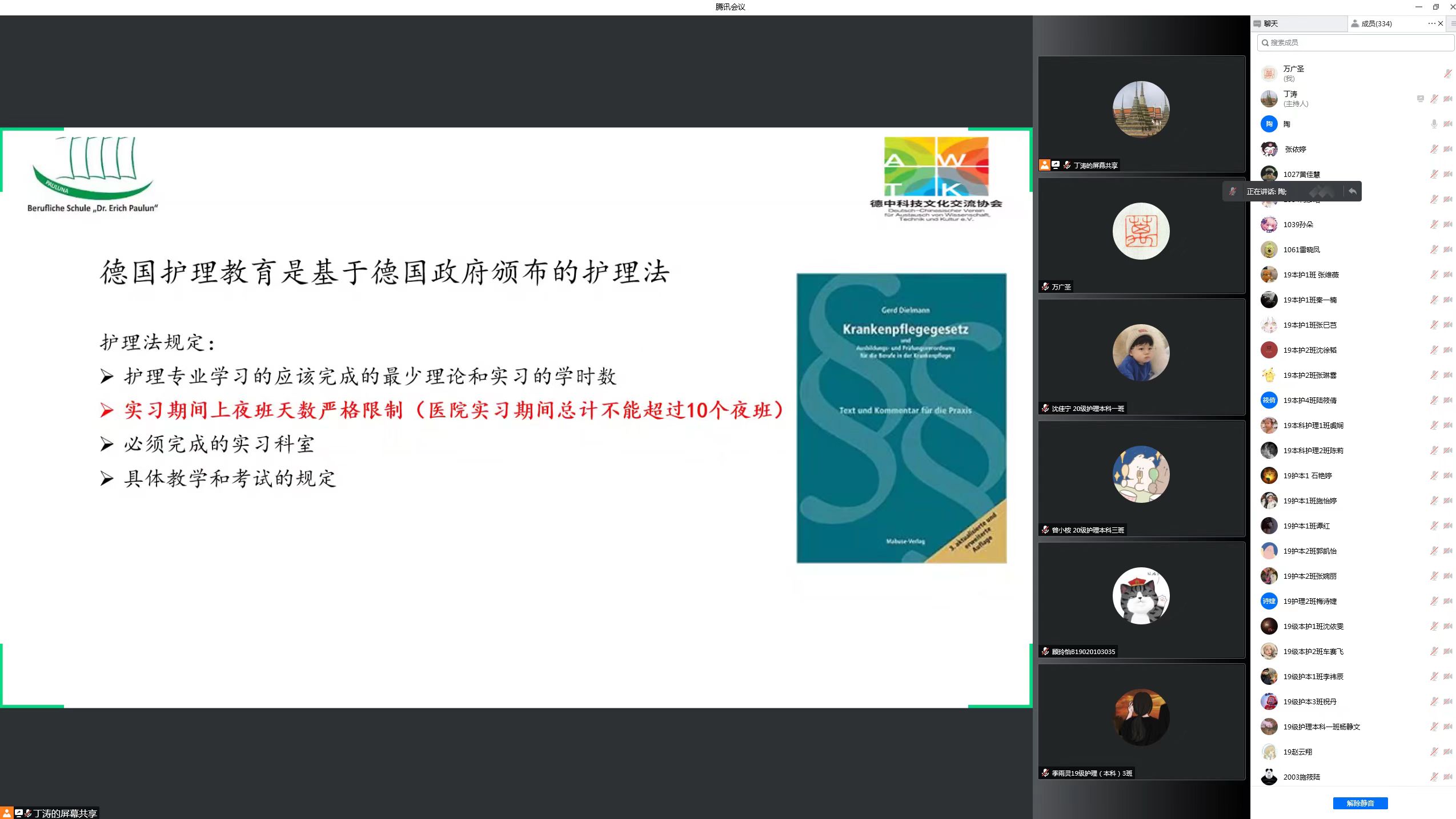 为拓展护理专业学生国际视野,培养国际化的护理专业人才,4月10日晚,护理与健康管理学院为2019级、2020级护理专业本科学生组织了一次主题为“德国护理教育发展现状及护理职业发展介绍”的线上交流会,超过330名护理本科专业学生参加了交流会。本次交流会邀请德中科技文化交流协会会长陶兴煜先生、德中文化交流协会秘书长丁涛先生一道参加。会议由护管学院外事办卜佳老师主持。