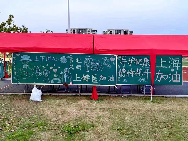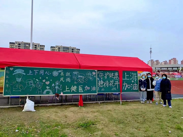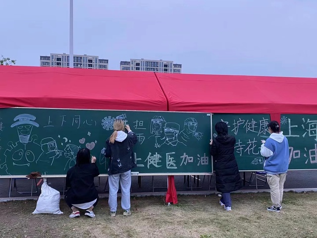 临床医学院2021级临床医学专业周瑜琦同学看到核酸检测现场的遮风黑板,在排队等待核酸采样期间,主动询问是否可以在黑板上留言,并向辅导员邵佳毅老师表达了心里的想法。老师得知后,非常赞同学生的做法,一起用彩色粉笔写下了“上海加油”四个大字。其他同学见后,也纷纷接力在黑板上留下了温暖人心的话语和可爱的插图。“上海加油,上健医加油”“上下同心,共担风雨,守护健康,静待花开”“大白画像”……一字一句,一笔一画,汇成板报,展露了心声,表达了同学们对战胜疫情的坚定信心。这不仅填充了黑板的空白,也让每一个排队核酸的同学感受到了上健医学子战胜疫情的决心。驻校核酸检测医生也在黑板前停下匆忙的脚步,用手机记录着疫情下的美好一幕,并为同学们的举动点赞。