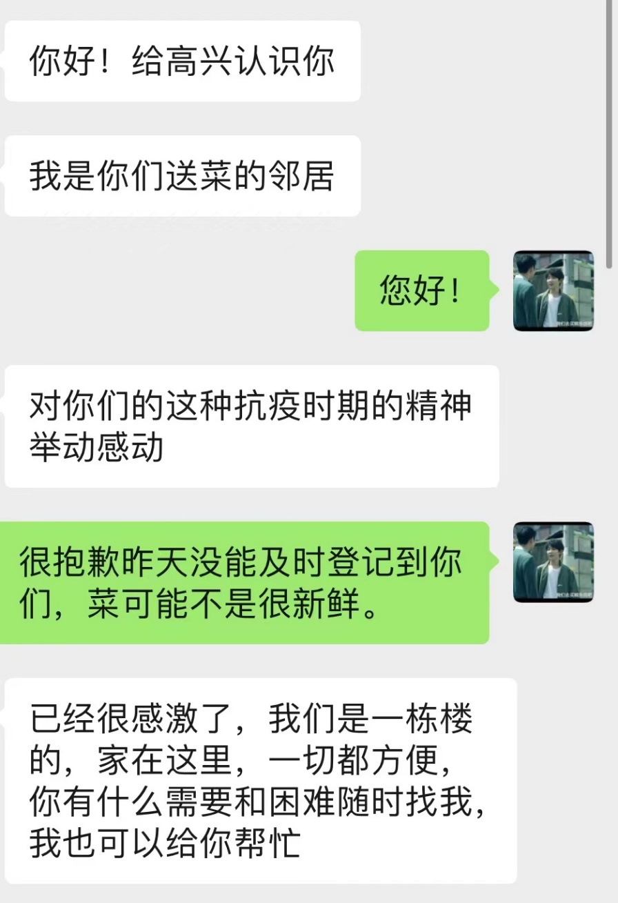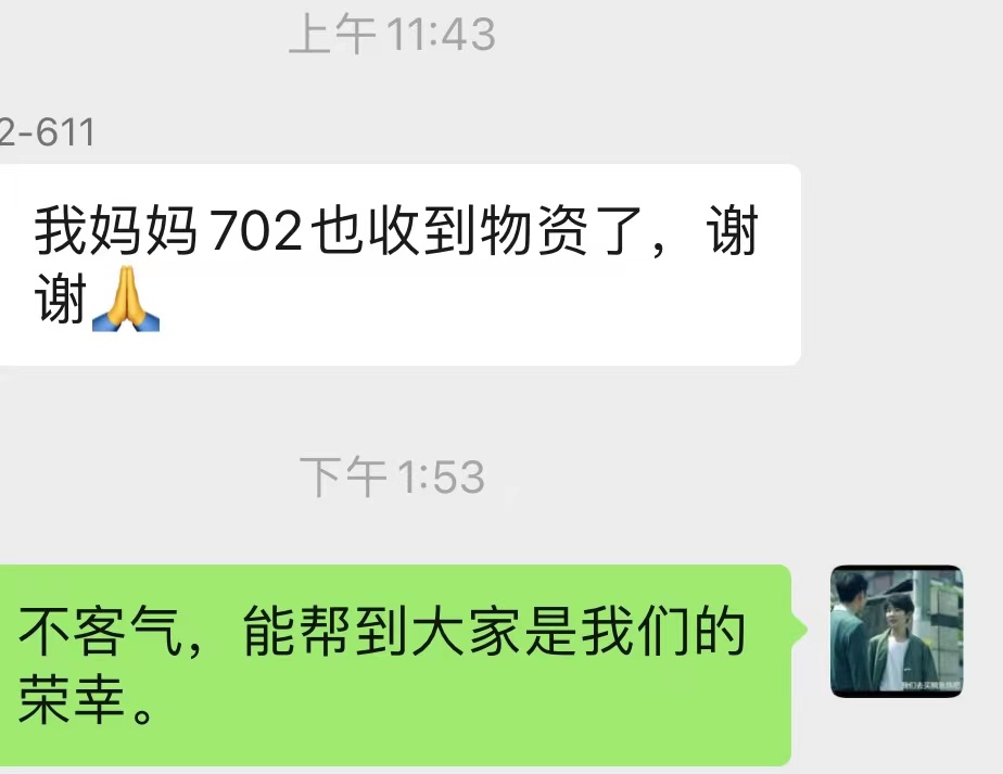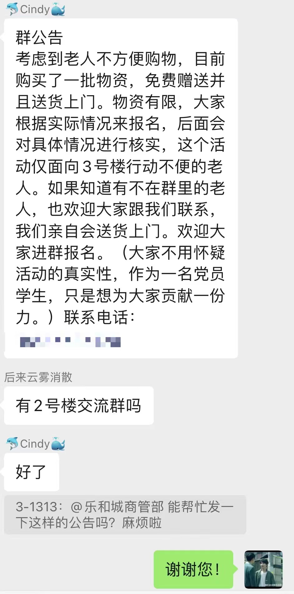 “谢谢你们年轻人细心关爱老人,传承了中华民族优良美德,再次感谢”“帮助弱者,大爱无疆,为你点赞”“母亲的药收到了,非常感谢”“对你们这种抗疫时期的精神举动感动……”“我妈702也收到物资了,谢谢”“不愧是医学院出来的好男人,优秀,为你点赞”“代表商管和物业感谢你们”……看着微信里弹出来的一条条信息,潘凯凯脸上露出开心的笑容。