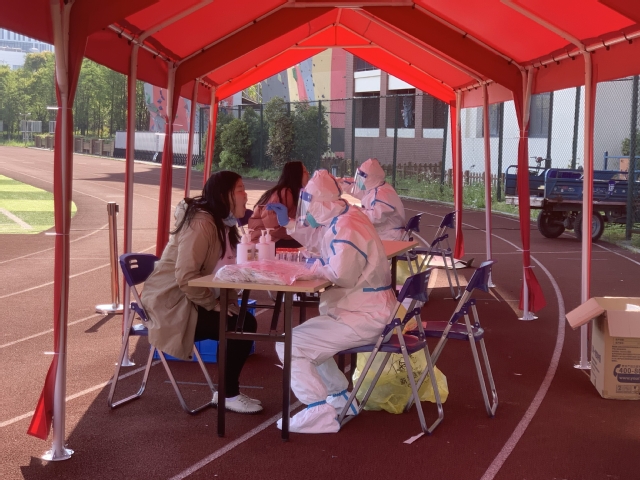 喝水,担心上厕所会耽误核酸的进度,也会污染防护服,有时甚至顾不上吃午饭。在这么高强度的工作下,还要与环境进行对抗——高温、刮风下雨时常出现,可她们仍默默坚守着,20多天,每天近8小时工作,每人每天近千人次采样……