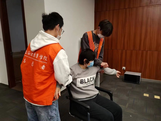 在长时间高强度连轴转的工作下,医护人员的肩颈、腰背部肌肉僵硬疼痛。看到医护人员的辛苦与坚守,康复学子希望结合专业为“大白”们做点什么。经过康复学院院长郭琪专业细致地培训后,新南苑的同学们踊跃报名组成康复理疗志愿者团队,轮流给医护人员进行推拿按摩和筋膜枪理疗放松,以推、拿、按、揉等多种手法,缓解医护人员的肌肉疲劳,利用筋膜枪帮助肌肉更快得到放松和恢复。
