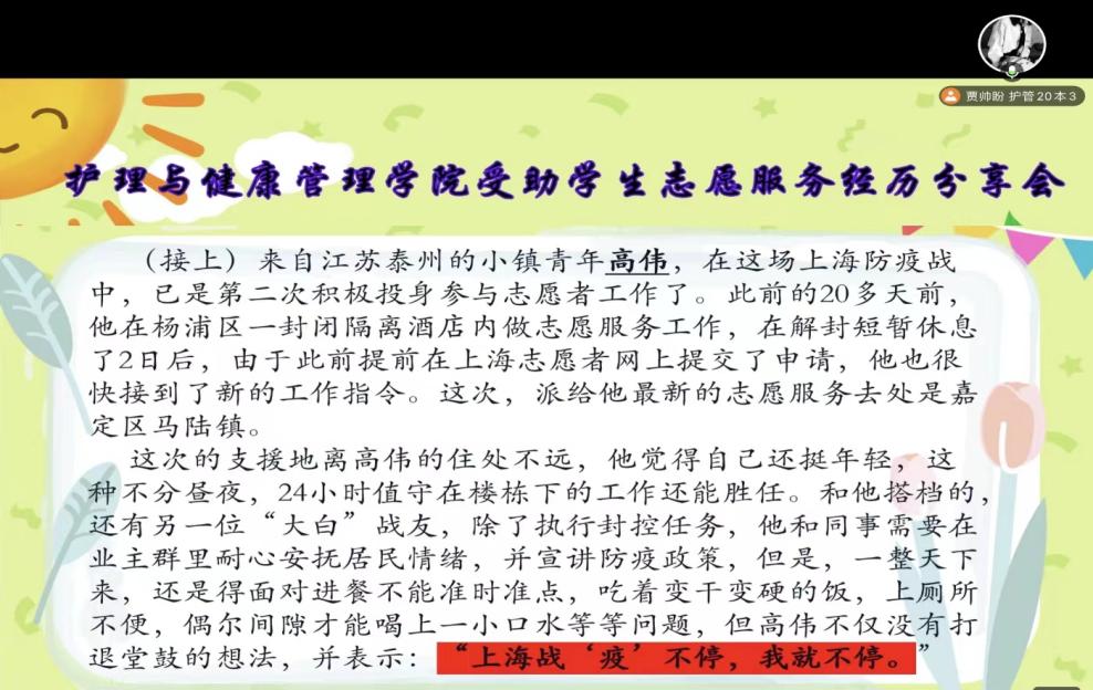 4月17日晚,护理与健康管理学院受助学生服务队组织了“共克时艰,守护‘健康’”志愿服务分享会,共有430人参加了线上腾讯会议。