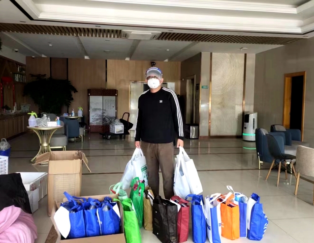 4月17日,鞠老师拿到物资后,进行消杀、分包,把家里能用的袋子都找出来了,最后还细心地贴上姓名和房间号,以便确保物资顺利到达学生手中。然而,眼下的道路交通却又成了摆在面前的一道难题,面对花花绿绿十几包沉甸甸的防疫物资,鞠老师愁眉不展,所幸最后几经波折终于顺利将这一份份承载着学院领导和老师们关爱之情的防疫物资送达酒店。农历三月,气温并不很高,鞠老师忙碌奔波却已是满头大汗,他一边擦拭汗水,一边反复叮嘱:“一定要送到学生房间门口哦,注意无接触配送,一定要提醒学生再次做好消杀,静放一段时间再打开用”。