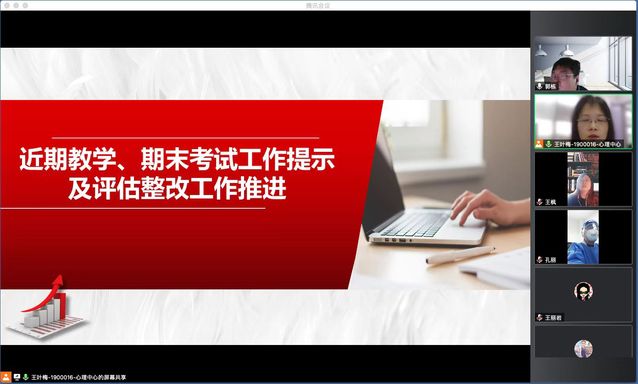 接着,王叶梅副教授对近期教学工作进行布置,包括期末考试工作提示及评估整改工作推进等。第一,为保障后续教学秩序平稳运行,任课教师需要准备好教学周第13-16周的学习资源,包括教学大纲、教学日历、课件、共享课程的资源链接、电子教材、课音视频、习题、作业、参考资料等。第二,敦促老师做好在线考试的准备,并对心理中心如何逐一落实考试命题、时间安排、考试流程、监考人员、平台使用与培训、考前模拟、学生通知和紧急情况处置进行了逐一部署。第三,按照学校要求进行理论和实践教学材料归档工作推进,尤其是做好试卷考核类材料的归档。